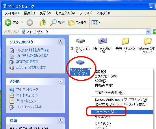 「マイコンピュータ」フォルダのなかの「リムーバブルディスク」のアイコン上で右クリックして、 以下の図のようにメニューで「フォーマット」を選択します。
