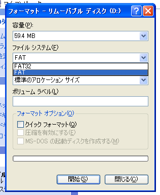 フォーマットのフレームでは必ずFAT を選択してフォーマットを実行します。